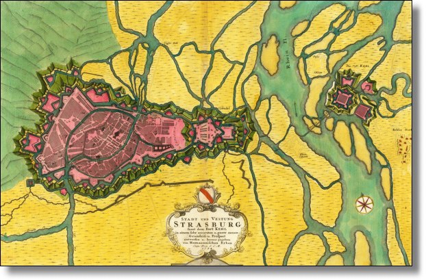 Der ungezähmte Rhein zwischen Straßburg (links) und Kehl um 1734 "Stadt und Vestung Strasburg samt dem Fort Kehl" von Johan Baptist Homann |