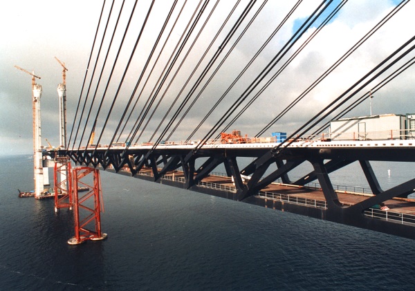 Die Pylonen bestehen aus Stahlbeton und sind ca. 220 m hoch, davon 203,50 m oberhalb des normalen Wasserspiegels im Sund. Sie wurden mit Kletterschalungen im 5-Tages-Rhytmus auf die versenkten Fundamente betoniert. Die Pylonen sind H-förmig gestaltet, wobei sich der Querriegel unterhalb des Fahrbahnträgers befindet. Für die Benutzer der Straße erscheinen die Pylone daher wie vier vertikale Stiele. Die insgesamt 80 Schrägseile wurden von einer französischen Spezialfirma eingebaut. Sie sind an jedem Pylonstiel in beide Richtungen harfenförmig angeordnet. Das kürzeste Kabel ist 52 m lang, das längste 275 m. Die Kabelmontage erfolgte gleichzeitig mit der Herstellung des zentralen Fahrbahnträgers. Durch die geringe Wassertiefe im Sund konnte der Träger mit Hilfe von temporären Stützen errichtet werden. Diese Bauweise ist billiger als der sonst bei Schrägseilbrücken bevorzugte Freie Vorbau. Außerdem können beim Freien Vorbau nur moderate Windgeschwindigkeiten toleriert werden.