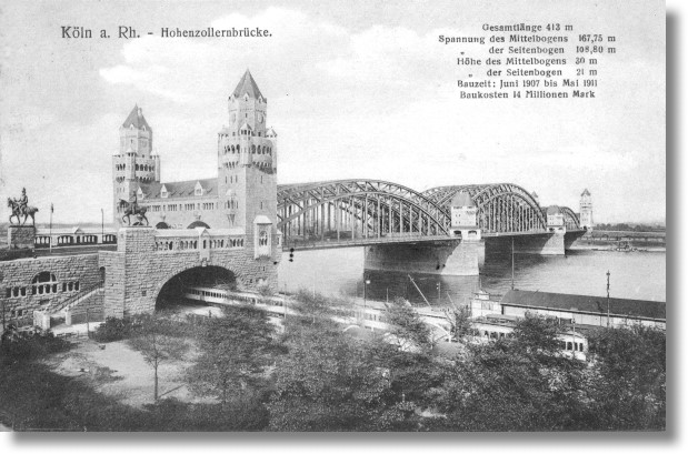 Die Südbrücke wurde übrigens 1910 fertig gestellt. Nur fünf Jahre später wurde mit der Deutzer Brücke auch Kölns erste reine Straßenbrücke über den Rhein in Betrieb genommen. Dabei handelte es sich um eine Hängebrücke, die nach ihrer Zerstörung im zweiten Weltkrieg als Hohlkastenträger wieder aufgebaut wurde.